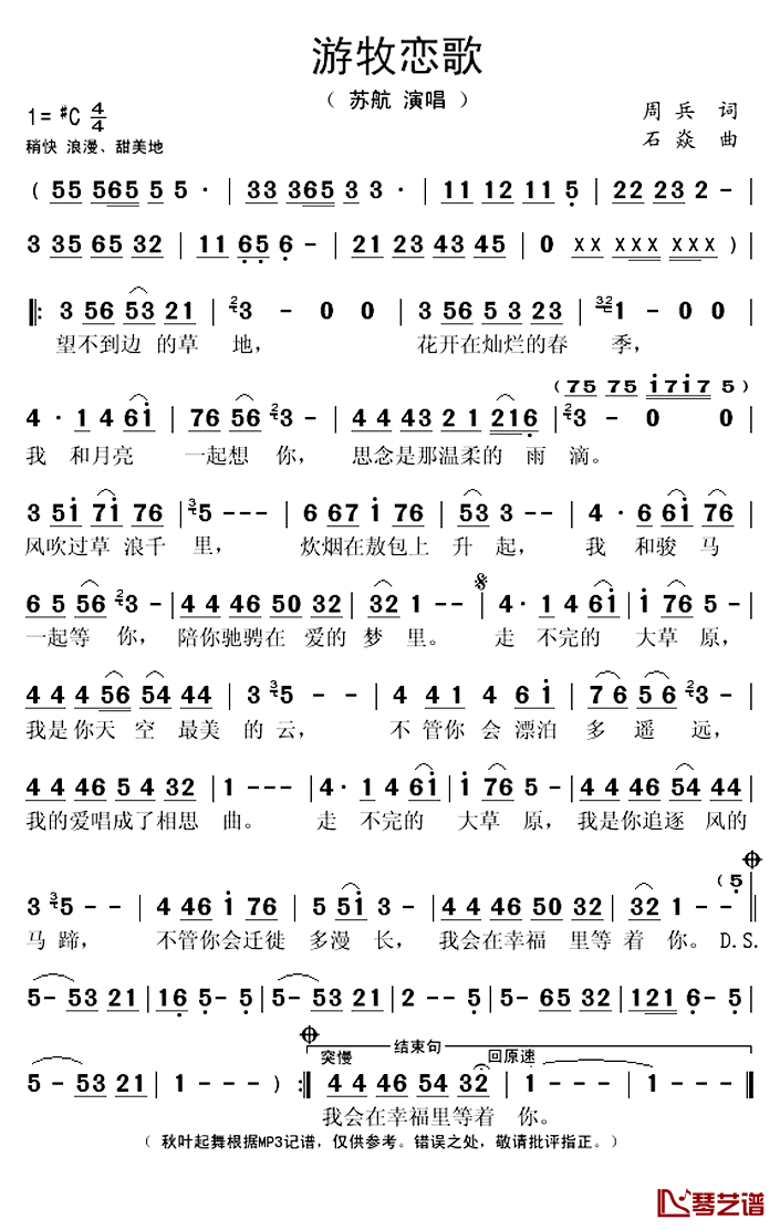 《苏航《游牧恋歌简谱》》内容来自于互联网,不能保证内容的准确性与完整性,仅供学习交流欣赏,请勿用于其它用途,内容版权归原作者及来源网站所有,如有侵犯到您的权益请来信告知,我们将及时删除。
