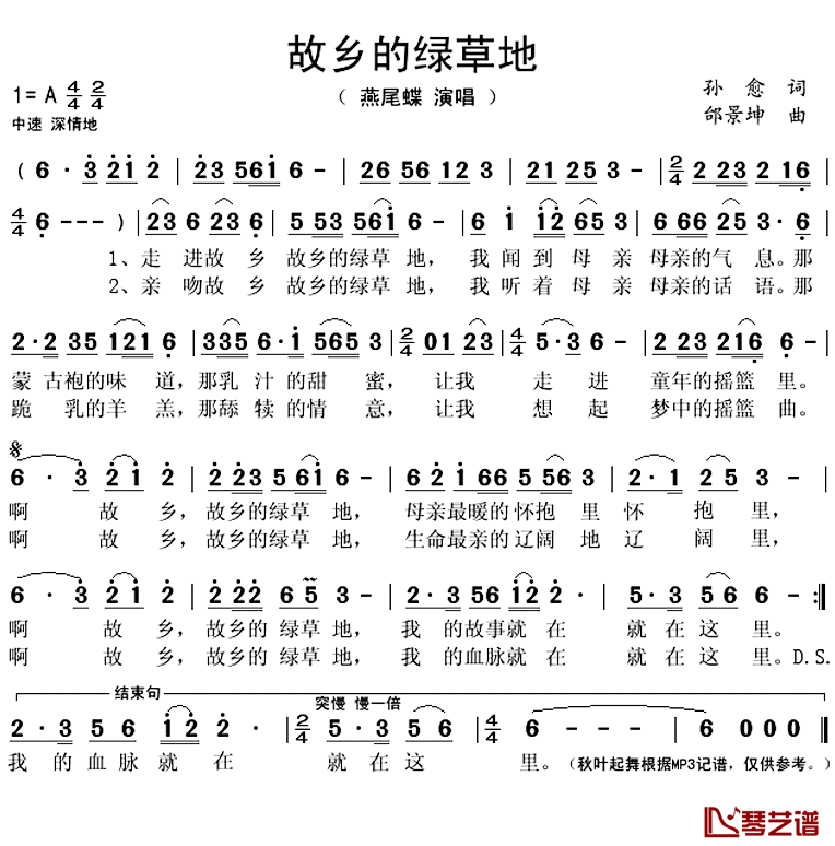 《燕尾蝶《故乡的绿草地简谱》》内容来自于互联网,不能保证内容的准确性与完整性,仅供学习交流欣赏,请勿用于其它用途,内容版权归原作者及来源网站所有,如有侵犯到您的权益请来信告知,我们将及时删除。