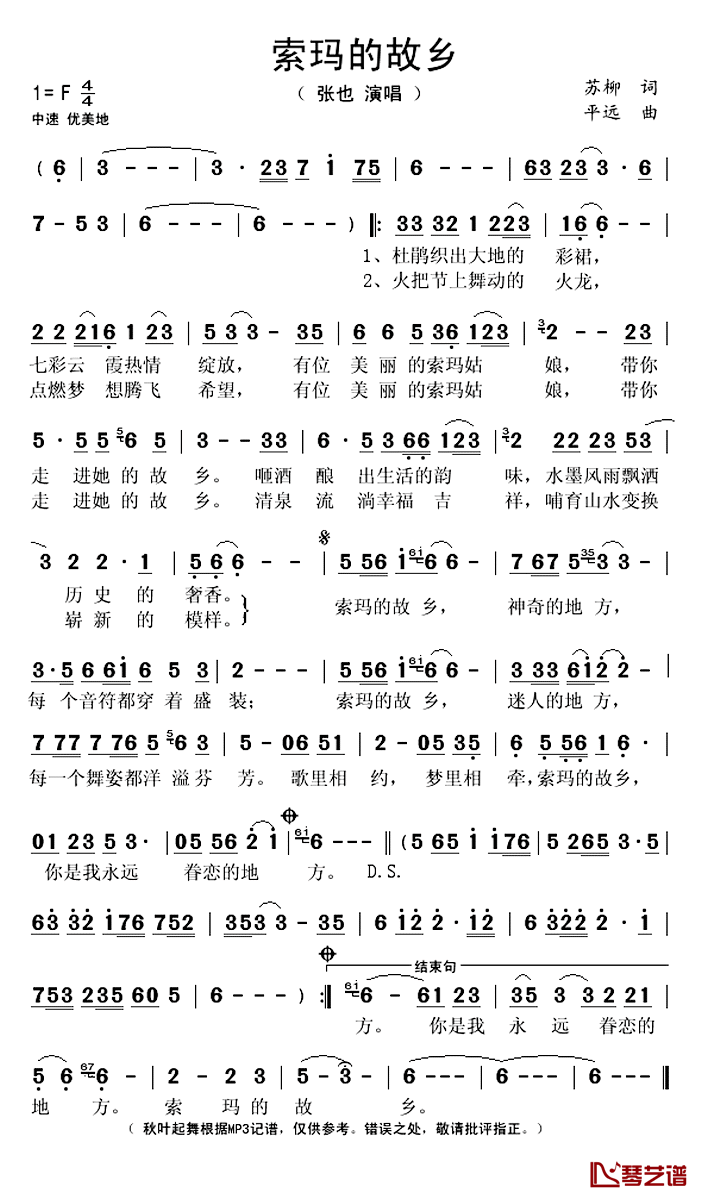 《张也《索玛的故乡简谱》》内容来自于互联网,不能保证内容的准确性与完整性,仅供学习交流欣赏,请勿用于其它用途,内容版权归原作者及来源网站所有,如有侵犯到您的权益请来信告知,我们将及时删除。