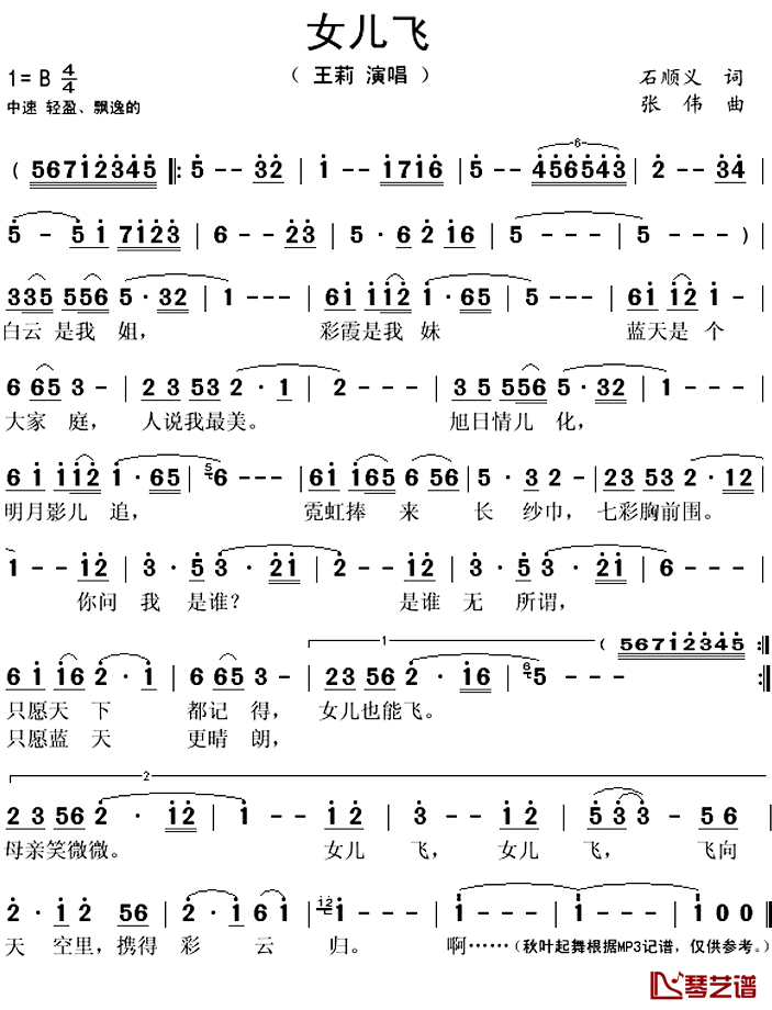 《王莉《女儿飞简谱》》内容来自于互联网,不能保证内容的准确性与完整性,仅供学习交流欣赏,请勿用于其它用途,内容版权归原作者及来源网站所有,如有侵犯到您的权益请来信告知,我们将及时删除。