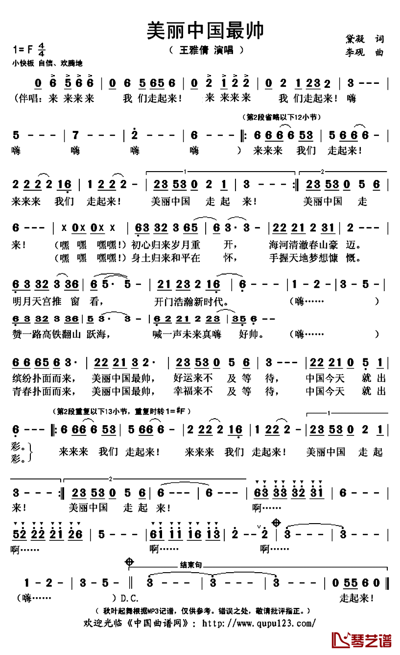 《王雅倩《美丽中国最帅简谱》》内容来自于互联网,不能保证内容的准确性与完整性,仅供学习交流欣赏,请勿用于其它用途,内容版权归原作者及来源网站所有,如有侵犯到您的权益请来信告知,我们将及时删除。