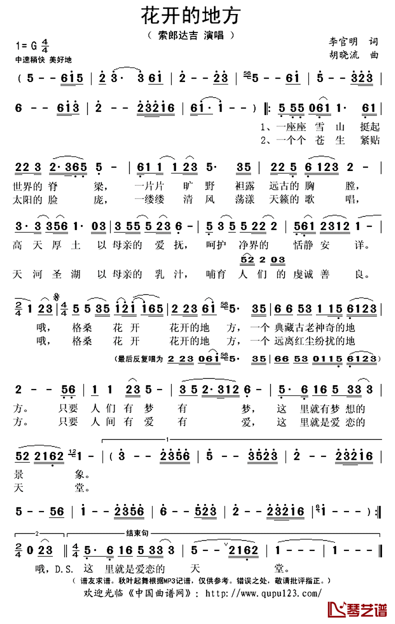 《索郎达吉《花开的地方简谱》》内容来自于互联网,不能保证内容的准确性与完整性,仅供学习交流欣赏,请勿用于其它用途,内容版权归原作者及来源网站所有,如有侵犯到您的权益请来信告知,我们将及时删除。