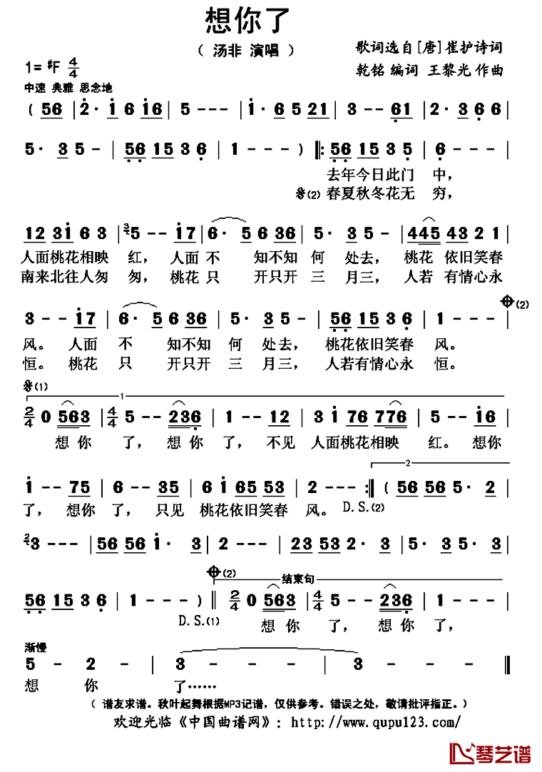 《汤非《想你了简谱》》内容来自于互联网,不能保证内容的准确性与完整性,仅供学习交流欣赏,请勿用于其它用途,内容版权归原作者及来源网站所有,如有侵犯到您的权益请来信告知,我们将及时删除。