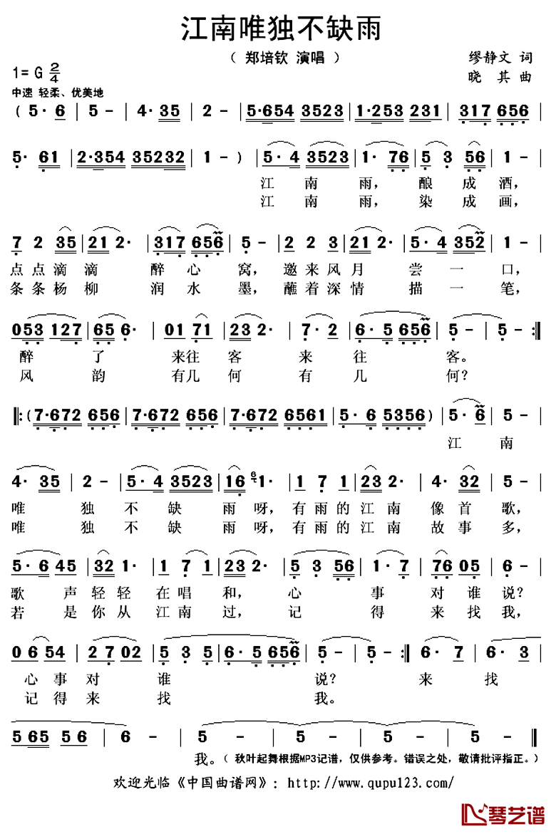 《郑培钦《江南唯独不缺雨简谱》》内容来自于互联网,不能保证内容的准确性与完整性,仅供学习交流欣赏,请勿用于其它用途,内容版权归原作者及来源网站所有,如有侵犯到您的权益请来信告知,我们将及时删除。