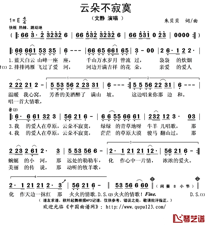 《文静《云朵不寂寞简谱》》内容来自于互联网,不能保证内容的准确性与完整性,仅供学习交流欣赏,请勿用于其它用途,内容版权归原作者及来源网站所有,如有侵犯到您的权益请来信告知,我们将及时删除。