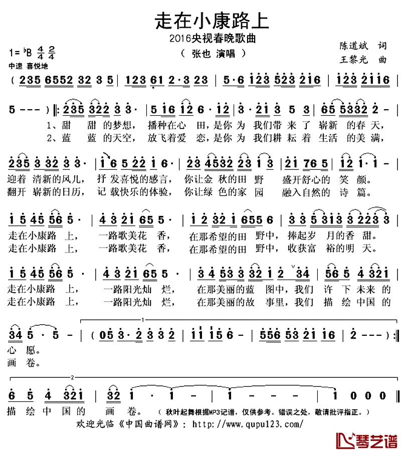 《张也《走在小康路上简谱》》内容来自于互联网,不能保证内容的准确性与完整性,仅供学习交流欣赏,请勿用于其它用途,内容版权归原作者及来源网站所有,如有侵犯到您的权益请来信告知,我们将及时删除。