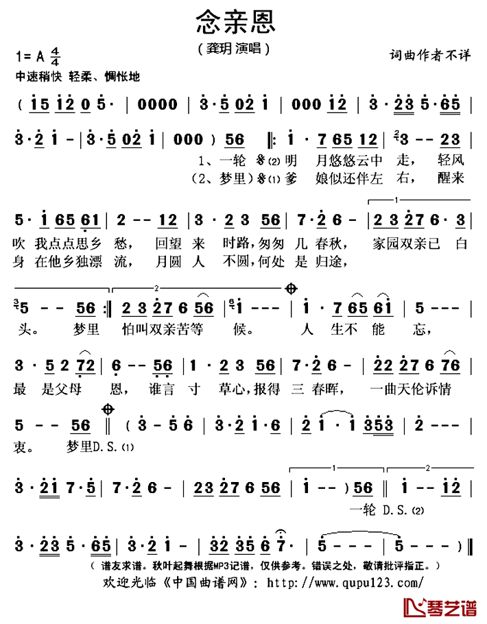 《龚玥《念亲恩简谱》》内容来自于互联网,不能保证内容的准确性与完整性,仅供学习交流欣赏,请勿用于其它用途,内容版权归原作者及来源网站所有,如有侵犯到您的权益请来信告知,我们将及时删除。