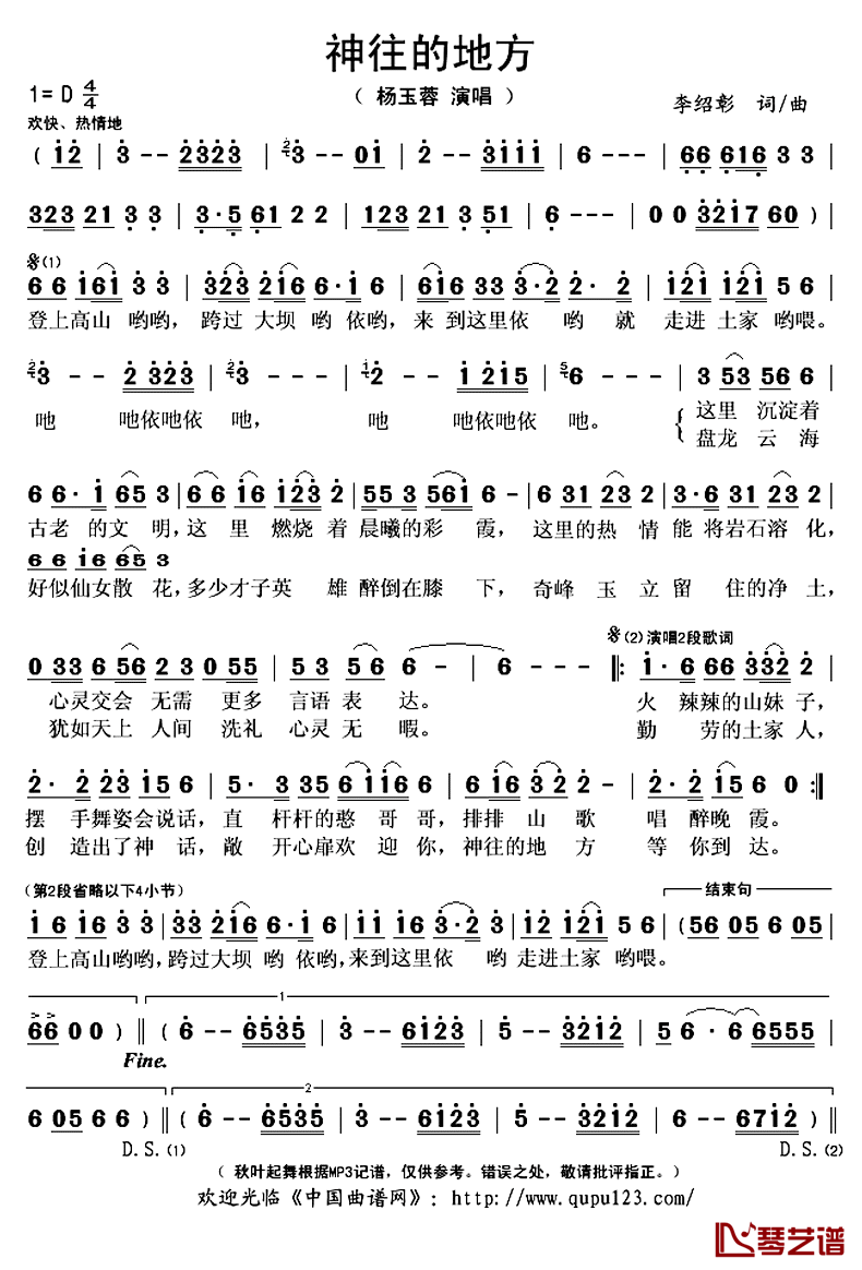 《杨玉蓉《神往的地方简谱》》内容来自于互联网,不能保证内容的准确性与完整性,仅供学习交流欣赏,请勿用于其它用途,内容版权归原作者及来源网站所有,如有侵犯到您的权益请来信告知,我们将及时删除。
