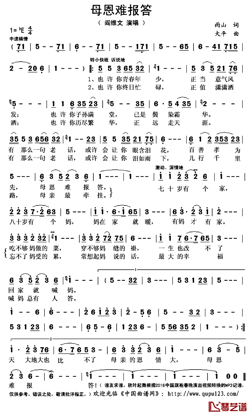 《阎维文《母恩难报答简谱》》内容来自于互联网,不能保证内容的准确性与完整性,仅供学习交流欣赏,请勿用于其它用途,内容版权归原作者及来源网站所有,如有侵犯到您的权益请来信告知,我们将及时删除。