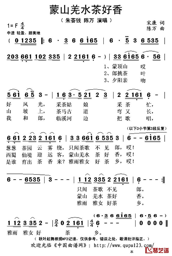 《朱荟钱、陈万《蒙山羌水茶好香简谱》》内容来自于互联网,不能保证内容的准确性与完整性,仅供学习交流欣赏,请勿用于其它用途,内容版权归原作者及来源网站所有,如有侵犯到您的权益请来信告知,我们将及时删除。