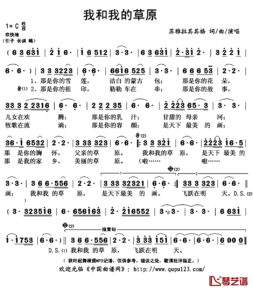《苏雅拉其其格《我和我的草原简谱》》内容来自于互联网,不能保证内容的准确性与完整性,仅供学习交流欣赏,请勿用于其它用途,内容版权归原作者及来源网站所有,如有侵犯到您的权益请来信告知,我们将及时删除。