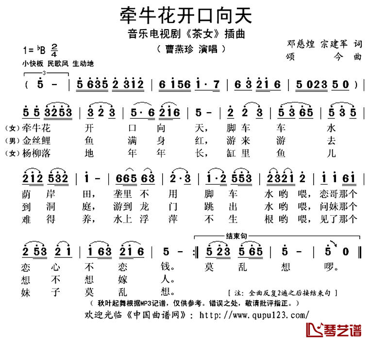 《曹燕珍《牵牛花开口向天简谱》》内容来自于互联网,不能保证内容的准确性与完整性,仅供学习交流欣赏,请勿用于其它用途,内容版权归原作者及来源网站所有,如有侵犯到您的权益请来信告知,我们将及时删除。