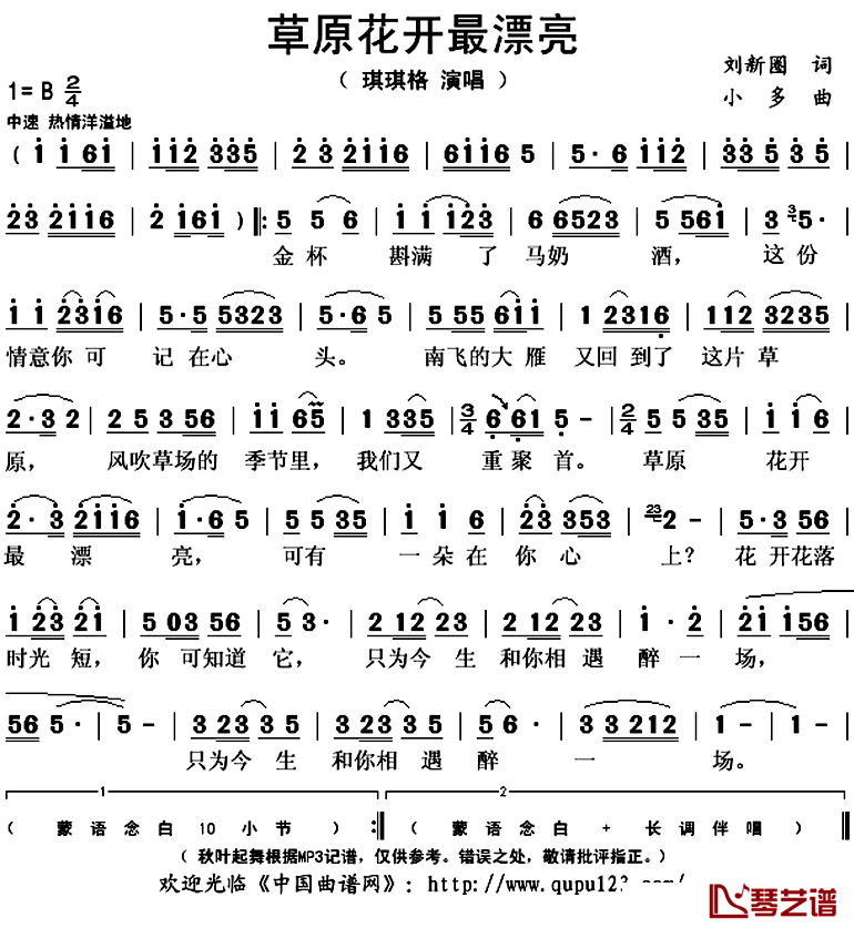 《琪琪格《草原花开最漂亮简谱》》内容来自于互联网,不能保证内容的准确性与完整性,仅供学习交流欣赏,请勿用于其它用途,内容版权归原作者及来源网站所有,如有侵犯到您的权益请来信告知,我们将及时删除。