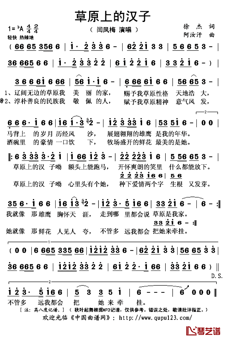 《闫凤梅《草原上的汉子简谱》》内容来自于互联网,不能保证内容的准确性与完整性,仅供学习交流欣赏,请勿用于其它用途,内容版权归原作者及来源网站所有,如有侵犯到您的权益请来信告知,我们将及时删除。