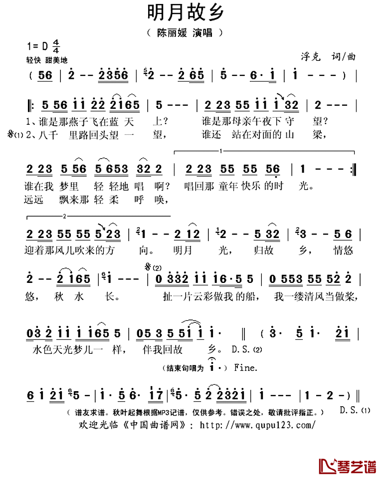 《陈丽媛《明月故乡简谱》》内容来自于互联网,不能保证内容的准确性与完整性,仅供学习交流欣赏,请勿用于其它用途,内容版权归原作者及来源网站所有,如有侵犯到您的权益请来信告知,我们将及时删除。