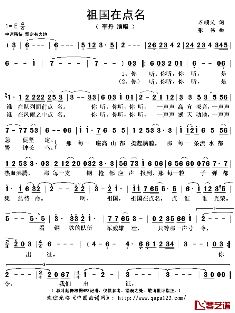 《李丹《祖国在点名简谱》》内容来自于互联网,不能保证内容的准确性与完整性,仅供学习交流欣赏,请勿用于其它用途,内容版权归原作者及来源网站所有,如有侵犯到您的权益请来信告知,我们将及时删除。