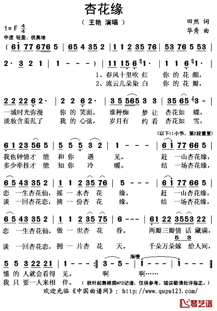 《王艳《杏花缘简谱》》内容来自于互联网,不能保证内容的准确性与完整性,仅供学习交流欣赏,请勿用于其它用途,内容版权归原作者及来源网站所有,如有侵犯到您的权益请来信告知,我们将及时删除。