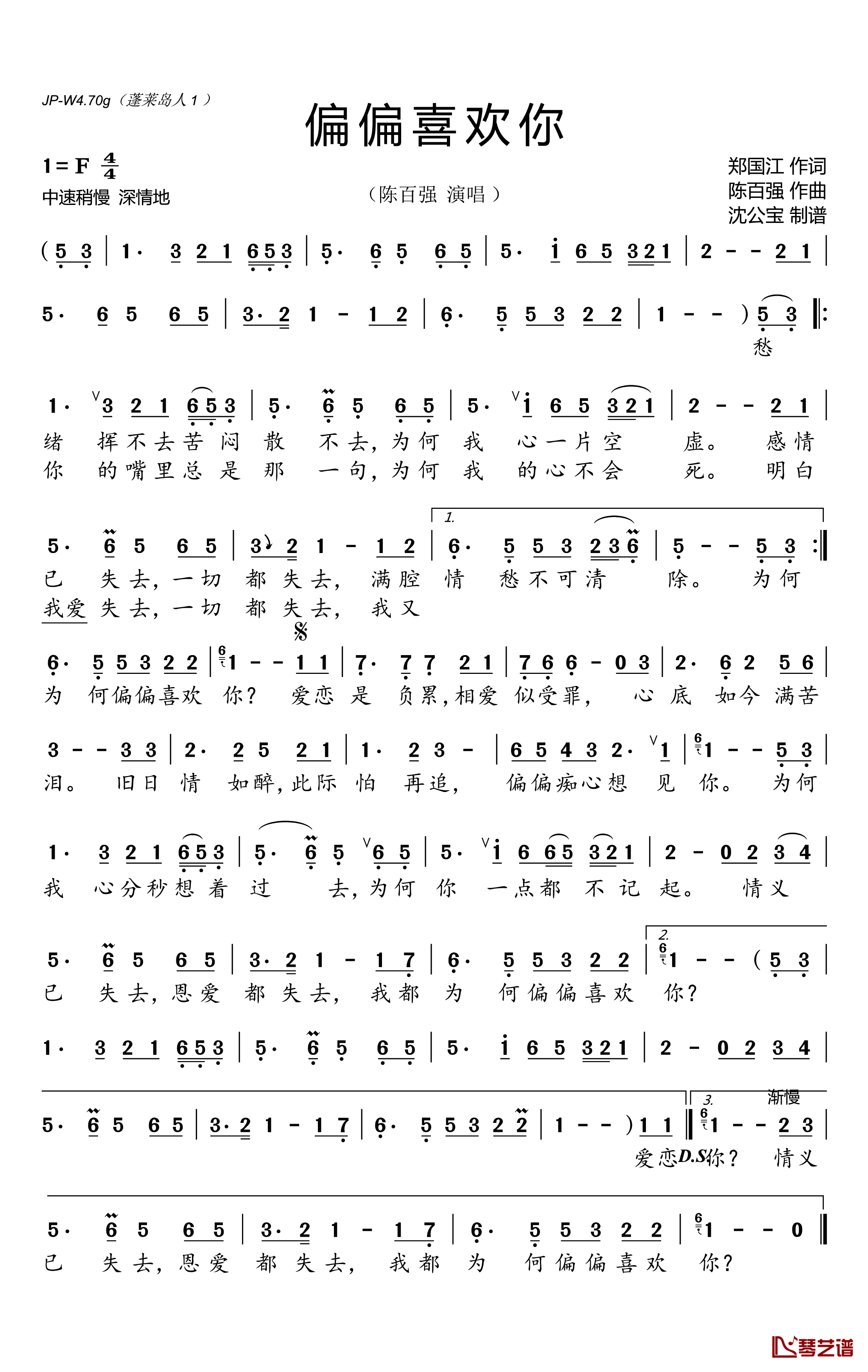《陈百强《偏偏喜欢你简谱》》内容来自于互联网,不能保证内容的准确性与完整性,仅供学习交流欣赏,请勿用于其它用途,内容版权归原作者及来源网站所有,如有侵犯到您的权益请来信告知,我们将及时删除。