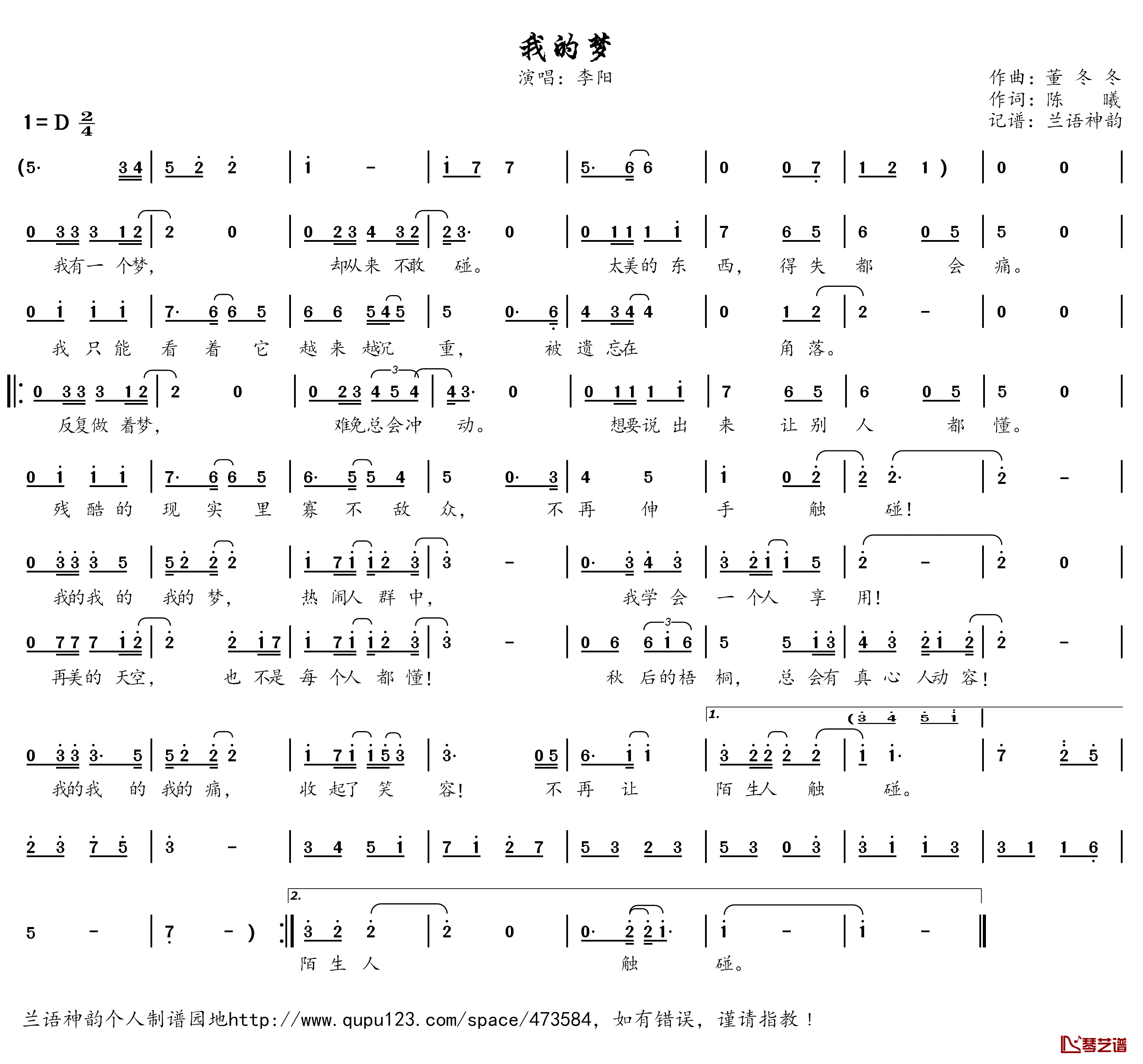 《李阳《我的梦简谱》》内容来自于互联网,不能保证内容的准确性与完整性,仅供学习交流欣赏,请勿用于其它用途,内容版权归原作者及来源网站所有,如有侵犯到您的权益请来信告知,我们将及时删除。