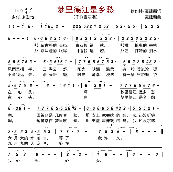 《千怜雪《梦里德江是乡愁简谱》》内容来自于互联网,不能保证内容的准确性与完整性,仅供学习交流欣赏,请勿用于其它用途,内容版权归原作者及来源网站所有,如有侵犯到您的权益请来信告知,我们将及时删除。