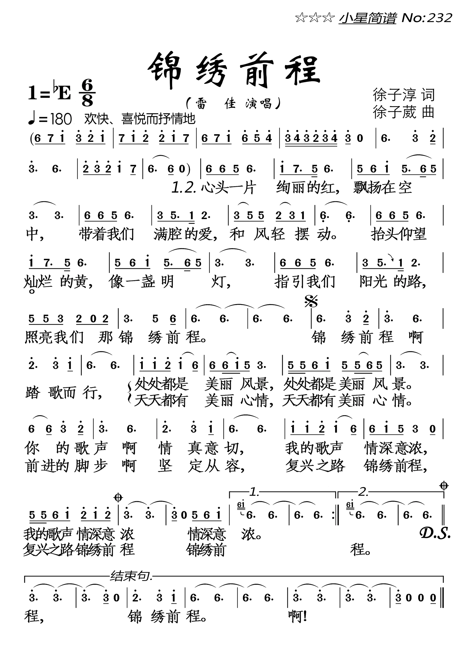 《雷佳《锦绣前程简谱》》内容来自于互联网,不能保证内容的准确性与完整性,仅供学习交流欣赏,请勿用于其它用途,内容版权归原作者及来源网站所有,如有侵犯到您的权益请来信告知,我们将及时删除。