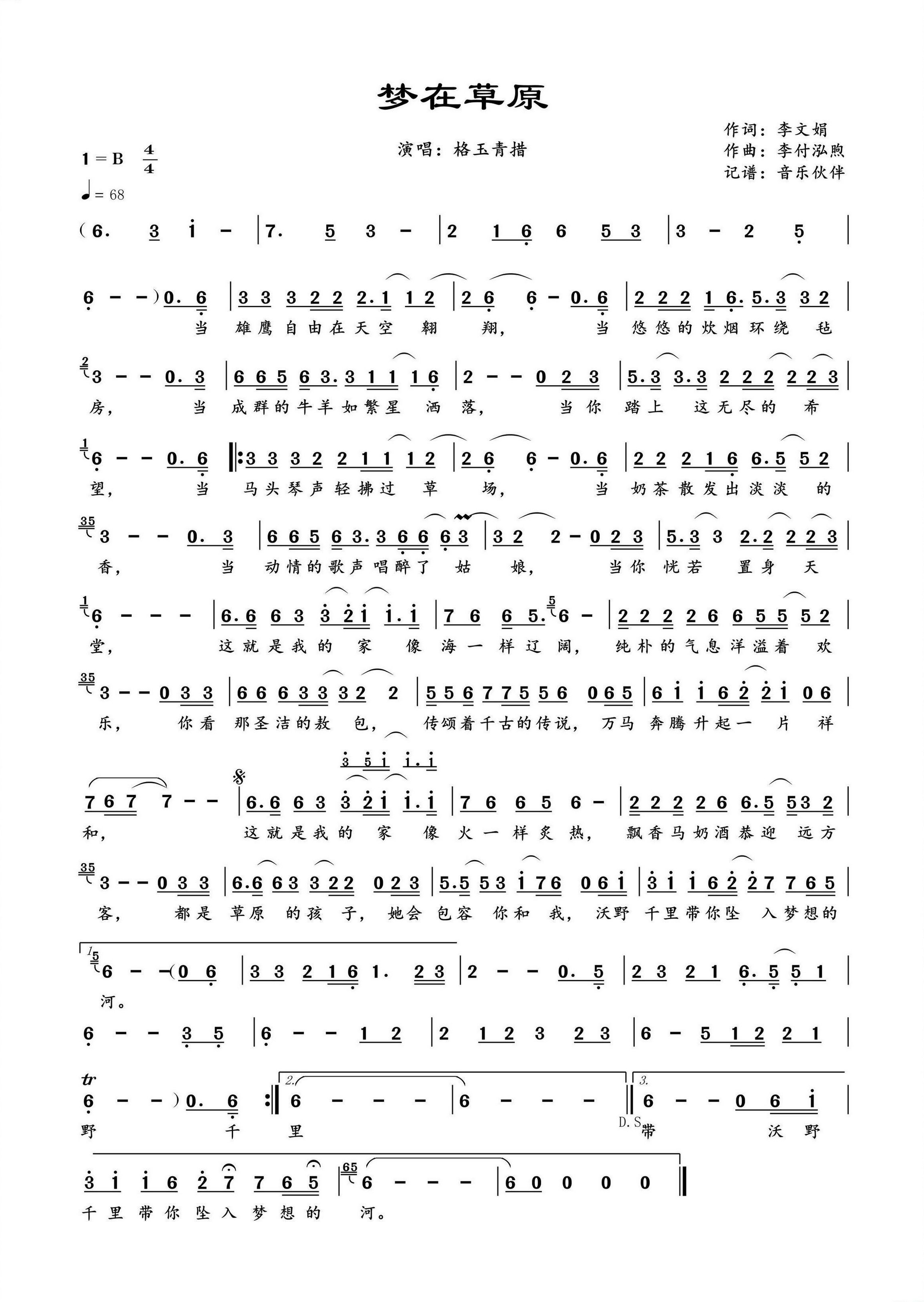 《格玉青措《梦在草原简谱》》内容来自于互联网,不能保证内容的准确性与完整性,仅供学习交流欣赏,请勿用于其它用途,内容版权归原作者及来源网站所有,如有侵犯到您的权益请来信告知,我们将及时删除。