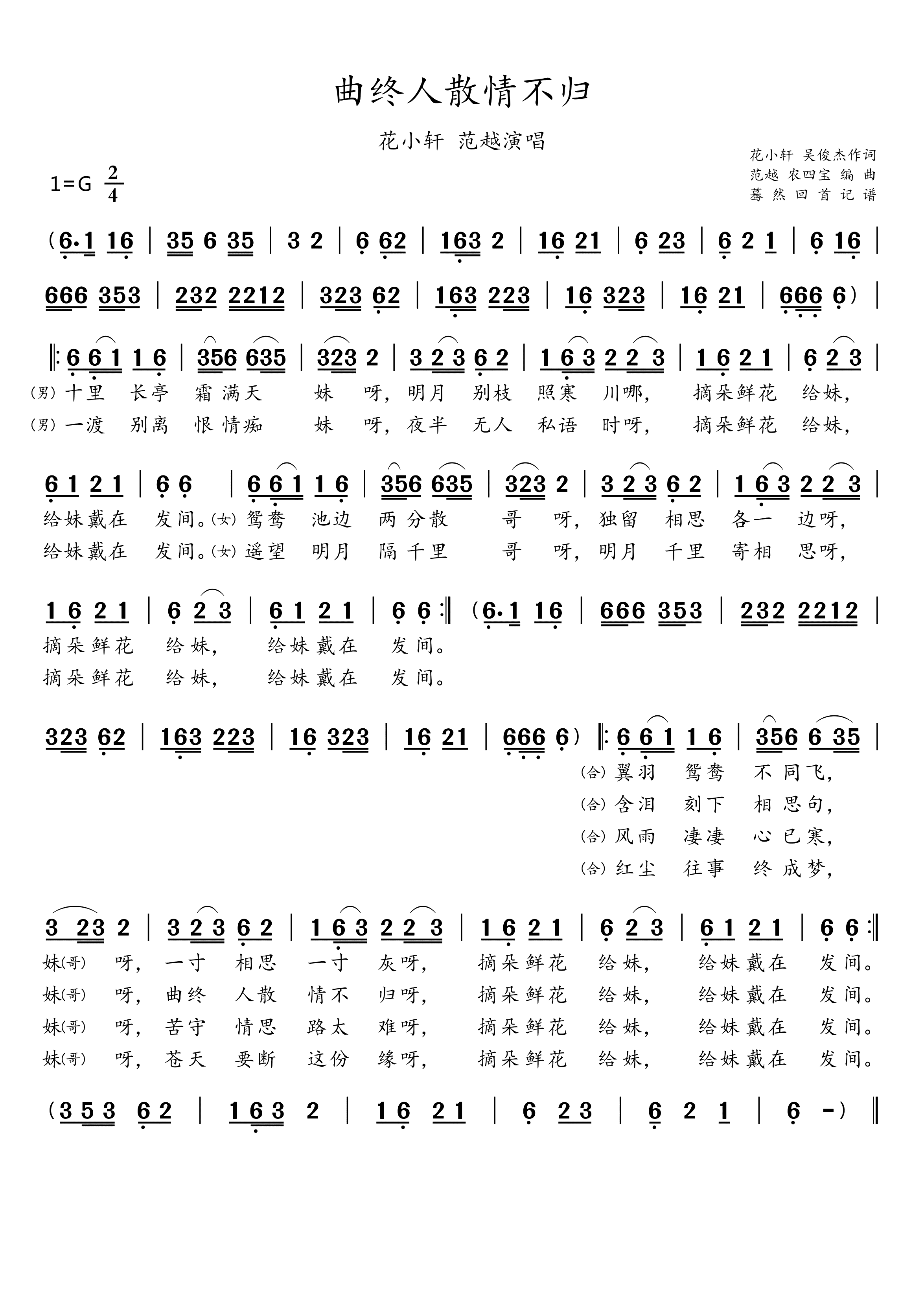 《花小轩《曲终人散情不归简谱》》内容来自于互联网,不能保证内容的准确性与完整性,仅供学习交流欣赏,请勿用于其它用途,内容版权归原作者及来源网站所有,如有侵犯到您的权益请来信告知,我们将及时删除。