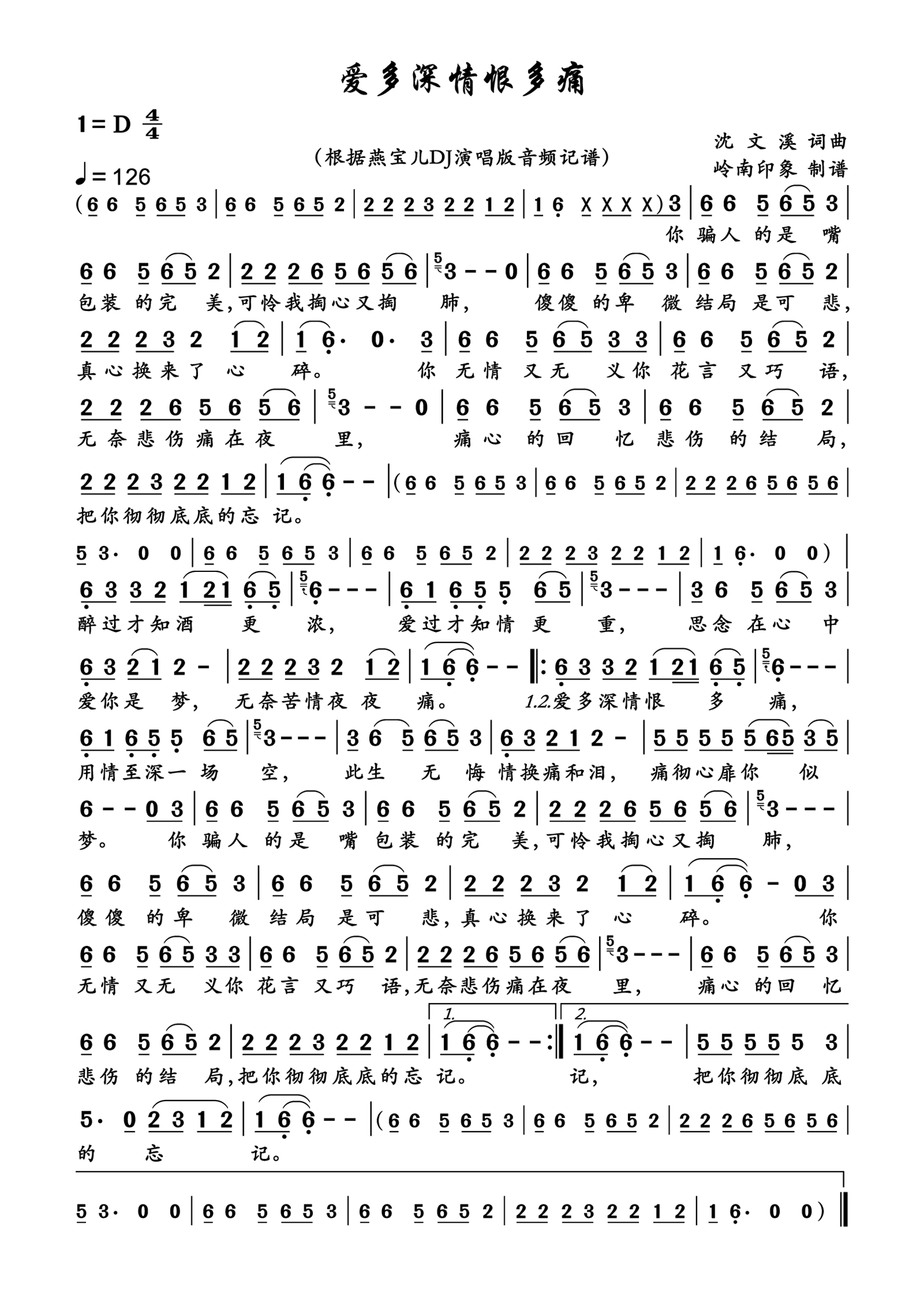 《燕宝儿《爱多深情恨多痛简谱》》内容来自于互联网,不能保证内容的准确性与完整性,仅供学习交流欣赏,请勿用于其它用途,内容版权归原作者及来源网站所有,如有侵犯到您的权益请来信告知,我们将及时删除。