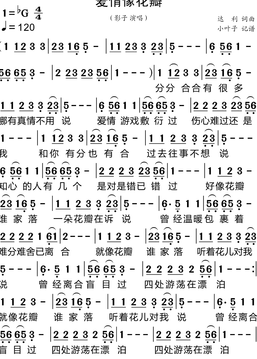 《影子《爱情像花瓣简谱》》内容来自于互联网,不能保证内容的准确性与完整性,仅供学习交流欣赏,请勿用于其它用途,内容版权归原作者及来源网站所有,如有侵犯到您的权益请来信告知,我们将及时删除。