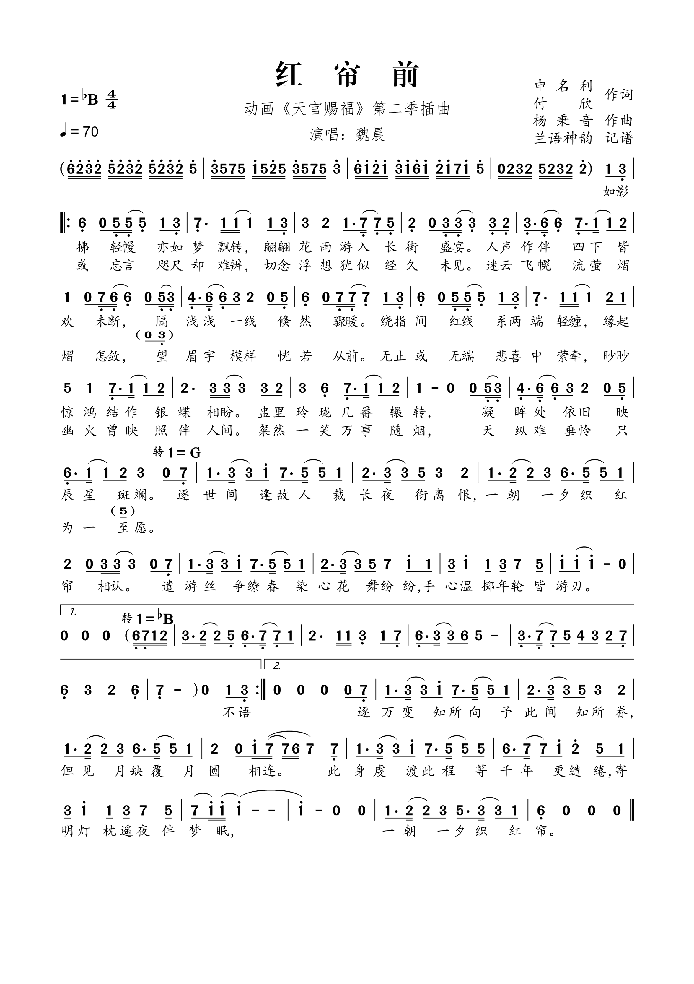 《魏晨《天官赐福简谱》》内容来自于互联网,不能保证内容的准确性与完整性,仅供学习交流欣赏,请勿用于其它用途,内容版权归原作者及来源网站所有,如有侵犯到您的权益请来信告知,我们将及时删除。