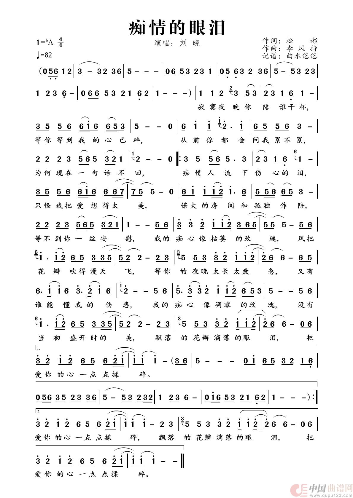 《刘晓《痴情的眼泪简谱》》内容来自于互联网,不能保证内容的准确性与完整性,仅供学习交流欣赏,请勿用于其它用途,内容版权归原作者及来源网站所有,如有侵犯到您的权益请来信告知,我们将及时删除。