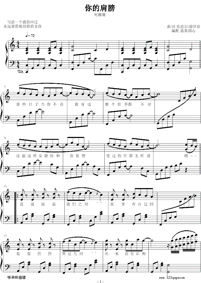 《何耀珊《你的肩膀钢琴谱》》内容来自于互联网,不能保证内容的准确性与完整性,仅供学习交流欣赏,请勿用于其它用途,内容版权归原作者及来源网站所有,如有侵犯到您的权益请来信告知,我们将及时删除。