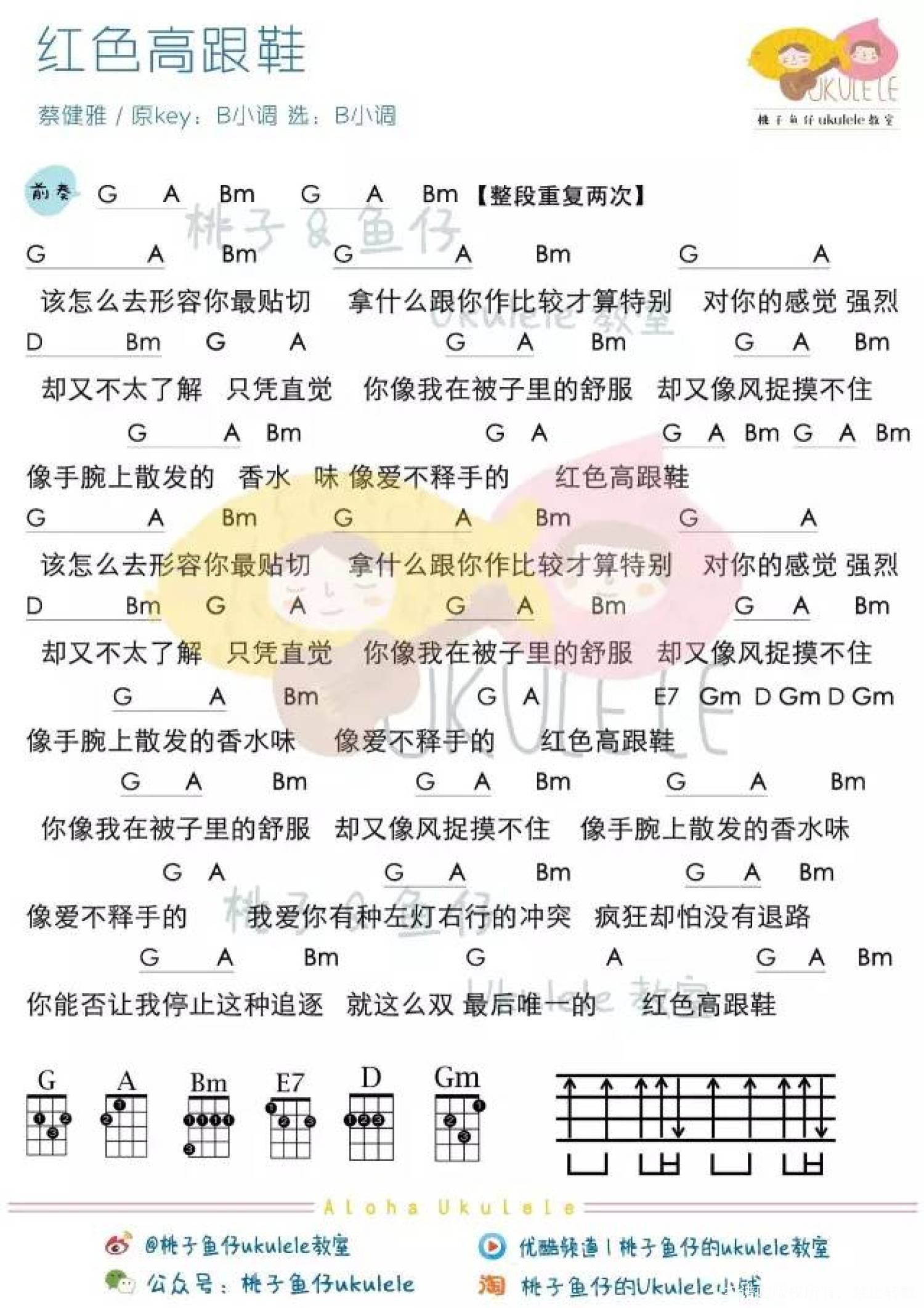 《蔡健雅《红色高跟鞋尤克里里谱》(G调)》内容来自于互联网,不能保证内容的准确性与完整性,仅供学习交流欣赏,请勿用于其它用途,内容版权归原作者及来源网站所有,如有侵犯到您的权益请来信告知,我们将及时删除。