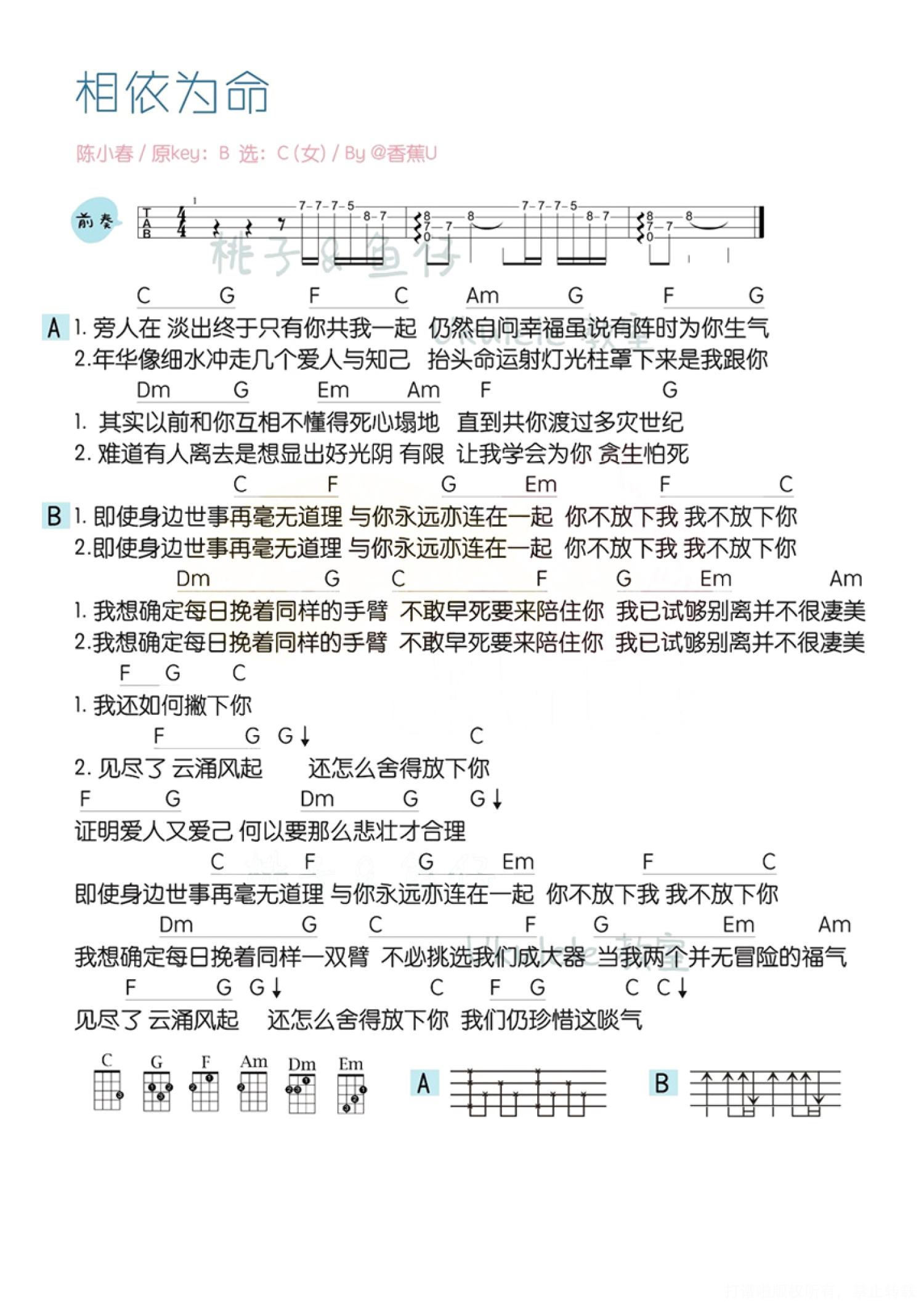 《陈小春《相依为命尤克里里谱》(C调)》内容来自于互联网,不能保证内容的准确性与完整性,仅供学习交流欣赏,请勿用于其它用途,内容版权归原作者及来源网站所有,如有侵犯到您的权益请来信告知,我们将及时删除。