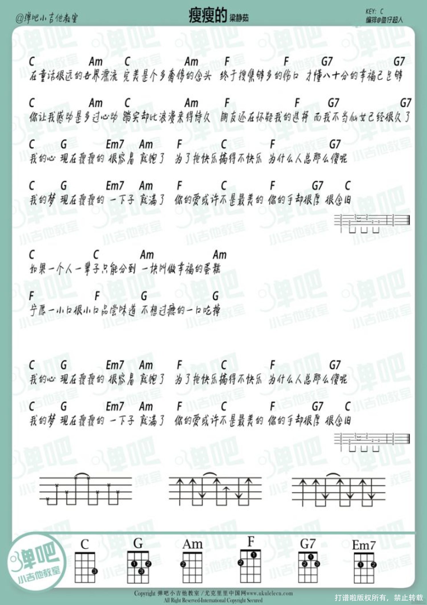 《梁静茹《瘦瘦的尤克里里谱》(C调)》内容来自于互联网,不能保证内容的准确性与完整性,仅供学习交流欣赏,请勿用于其它用途,内容版权归原作者及来源网站所有,如有侵犯到您的权益请来信告知,我们将及时删除。