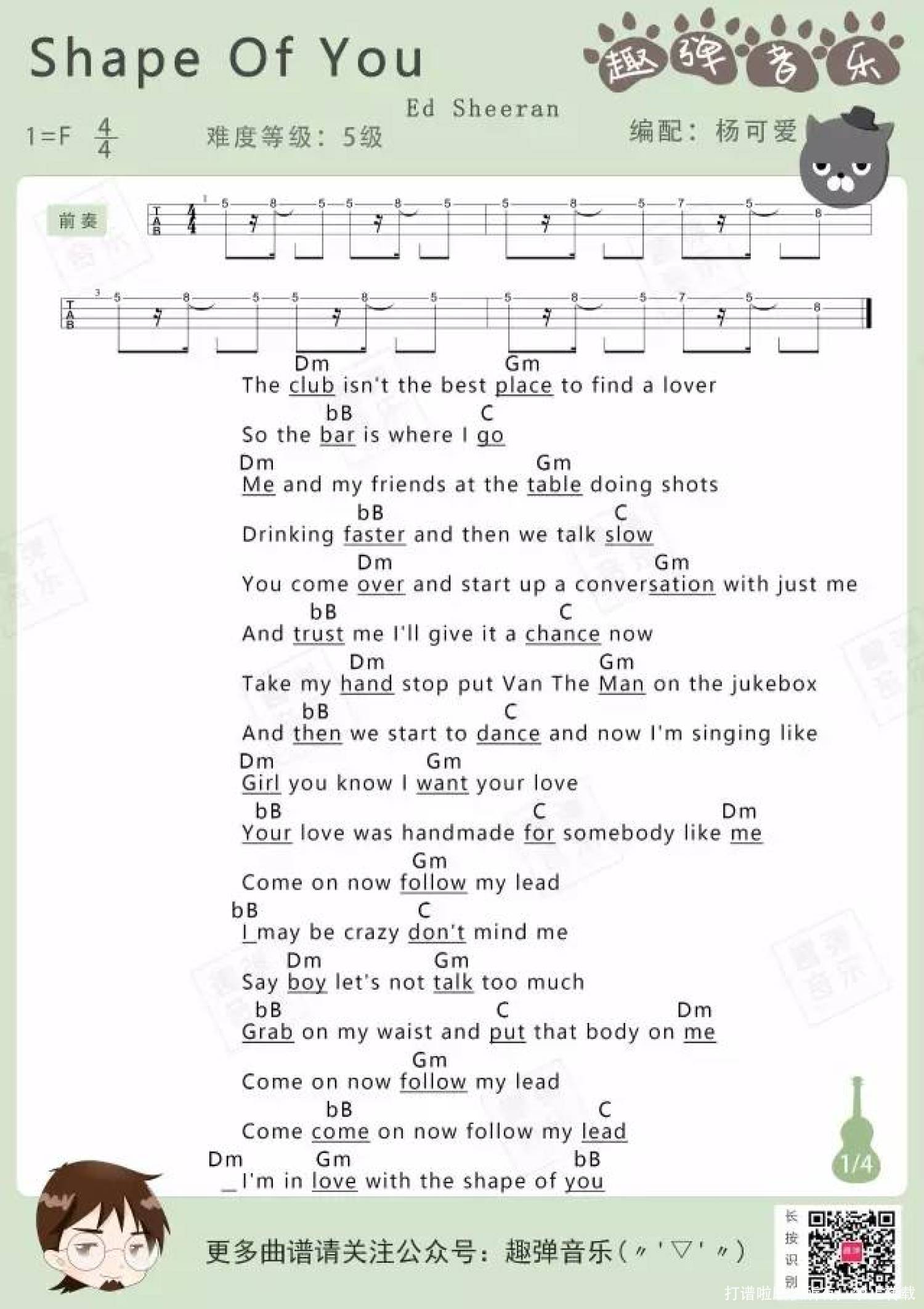 《Shape of You》是由艾德·希兰(Ed Sheeran)在1984年发布的一首歌曲。这首歌的演唱形式独特,融合了Shape和演唱的元素。曲谱的来源可以追溯到葛叔叔的扒谱制作,这里使用了3品的夹变调。这首歌的和弦编排相对较复杂,需要进行特殊调弦才能演奏