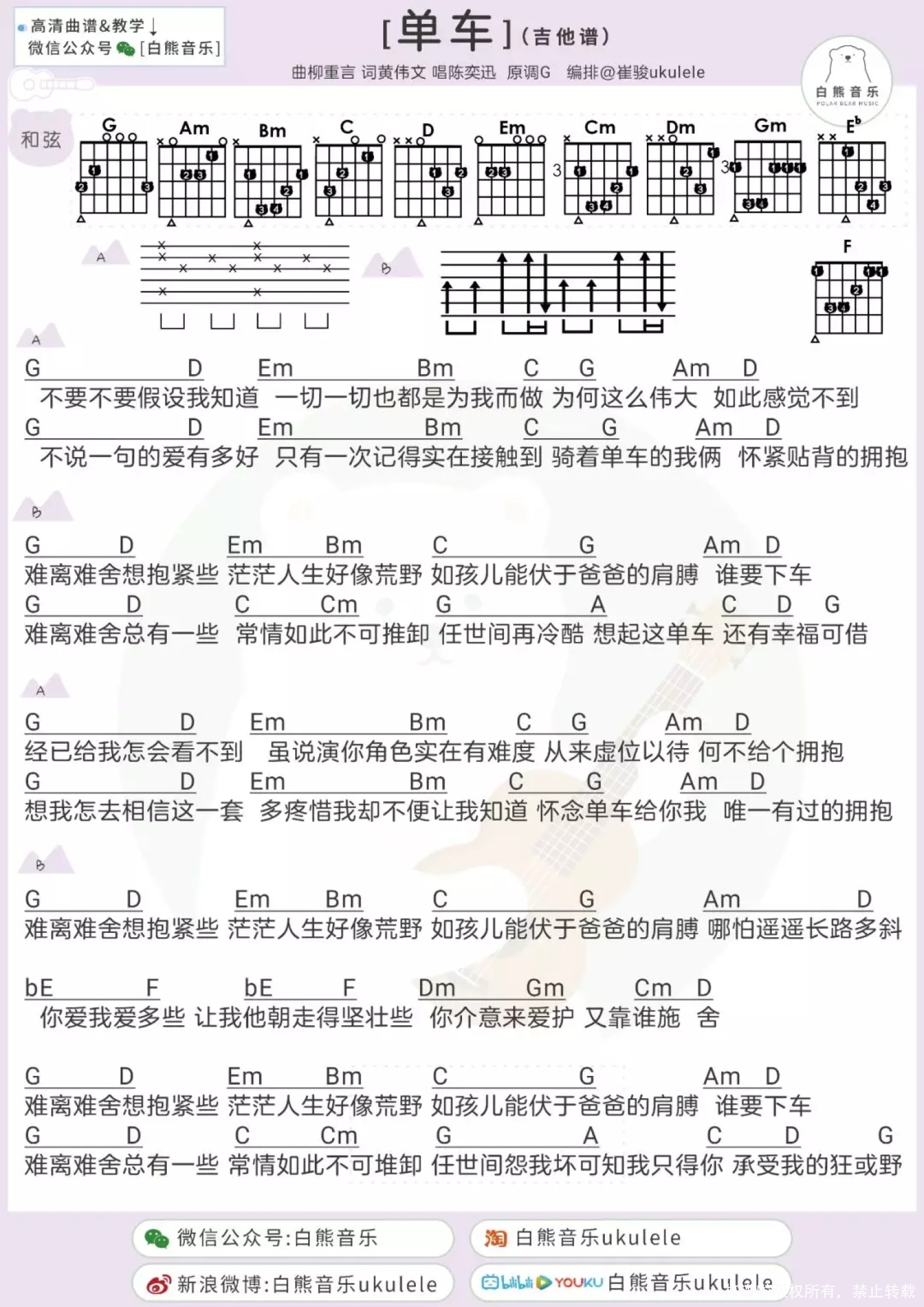 《陈奕迅《单车尤克里里谱》(G调)》内容来自于互联网,不能保证内容的准确性与完整性,仅供学习交流欣赏,请勿用于其它用途,内容版权归原作者及来源网站所有,如有侵犯到您的权益请来信告知,我们将及时删除。