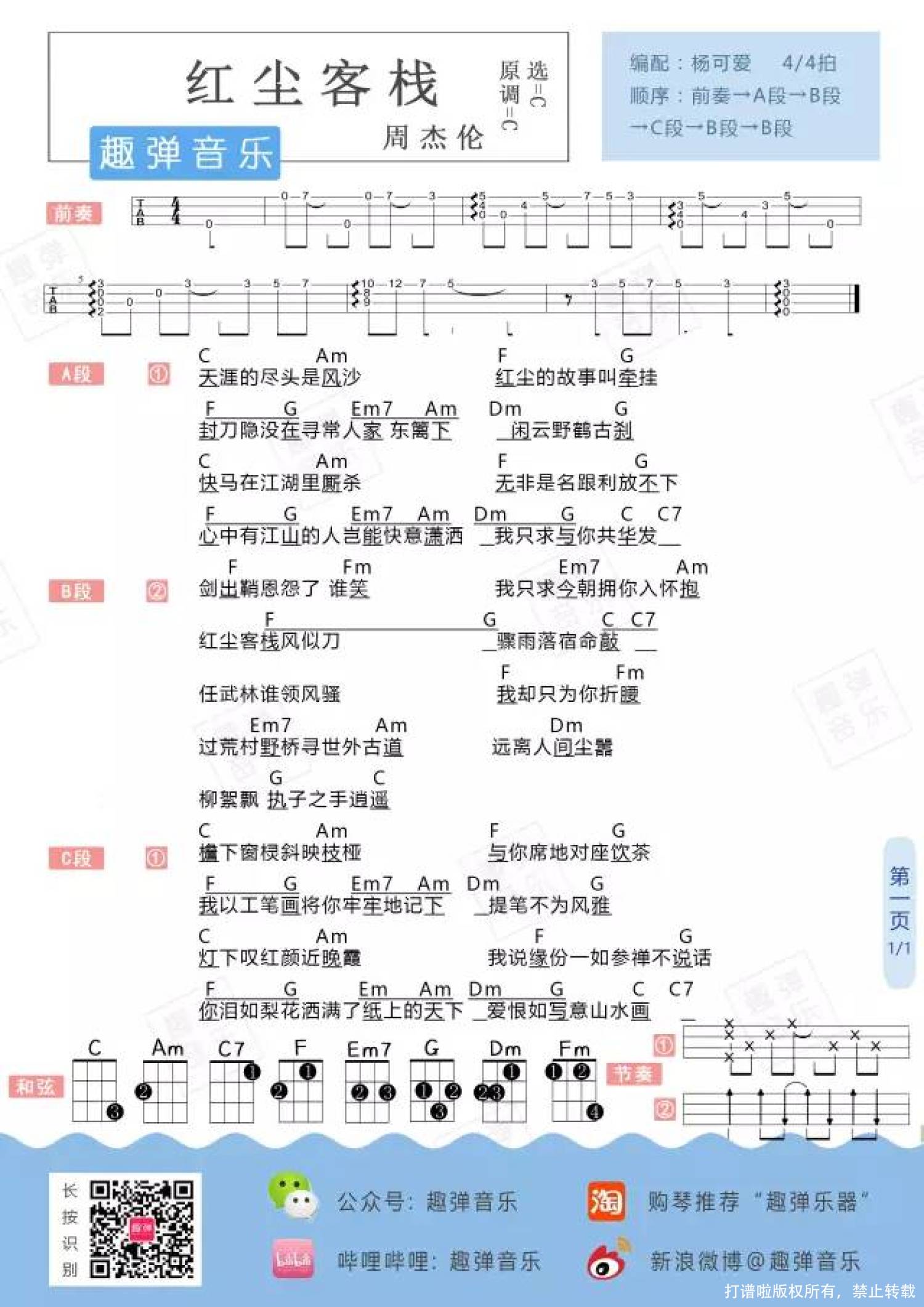 《周杰伦《红尘客栈尤克里里谱》》内容来自于互联网,不能保证内容的准确性与完整性,仅供学习交流欣赏,请勿用于其它用途,内容版权归原作者及来源网站所有,如有侵犯到您的权益请来信告知,我们将及时删除。
